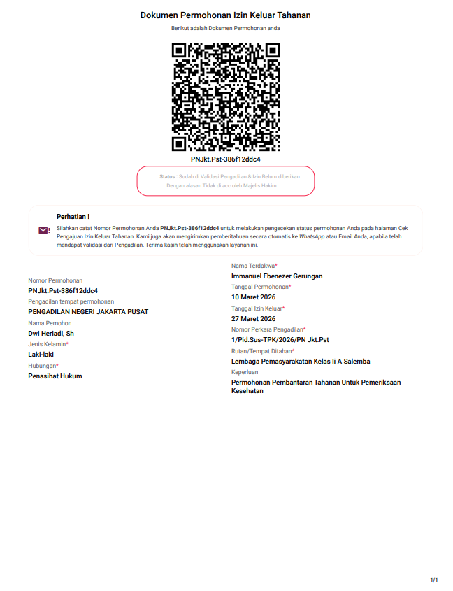 Menurut Silvia, permohonan tersebut diajukan sejak 10 Maret, setelah hasil pemeriksaan medis menunjukkan adanya kondisi yang membutuhkan tindakan lanjutan.