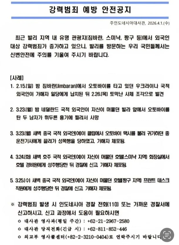 Pada 1 April 2026, Kedutaan Besar Republik Korea di Indonesia merilis imbauan keamanan yang berbeda dari biasanya. Alih-alih menggunakan bahasa umum seperti “tetap waspada”, pernyataan tersebut justru merinci sejumlah kasus kekerasan yang melibatkan warga negara asing dalam rentang waktu kurang dari dua bulan.