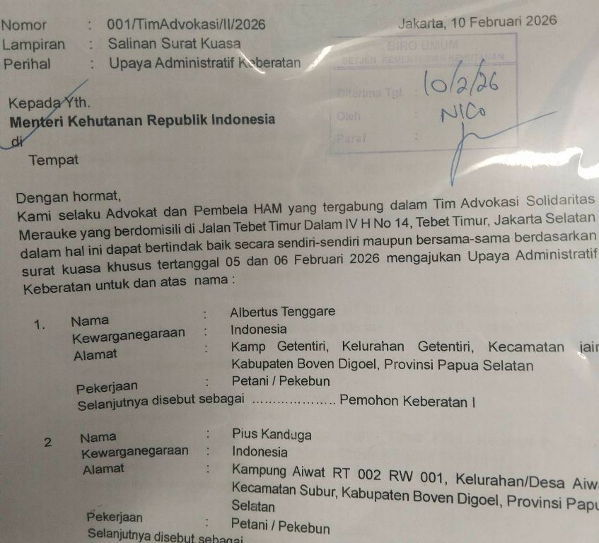 Untuk itu,12 orang perwakilan masyarakat adat dari Boven Digoel dan Merauke, Papua Selatan mengajukan Upaya Administratif Keberatan pada 10 Februari 2026 atas Keputusan Menteri Kehutanan Nomor 591 dan 430 Tahun 2025 yang melakukan perubahan status, demi tujuan pembangunan kawasan swasembada pangan, energi dan air nasional, provinsi Papua Selatan.